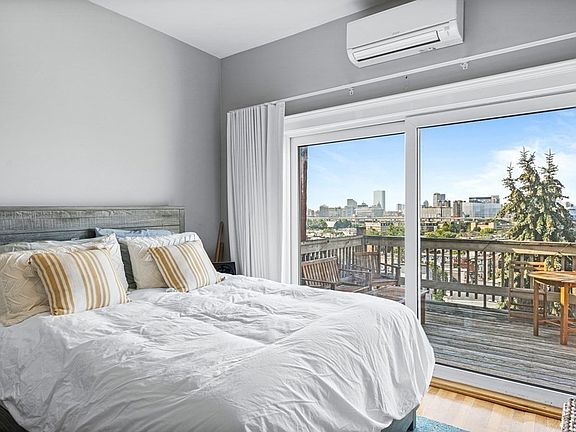 Penthouse gem in Charlestown, offers expansive City views from the private deck, fully renovated with an open floor plan and brick accent walls throughout. Living and Dining area features hardwood floors, soaring high ceilings, and custom lighting. Kitchen with breakfast bar, stone countertops, SS appliances, custom cabinetry and tile work. Master bedroom offers walk-out private deck with unbelievable views of Boston skyline. Guest bedroom with brick accents, HWD floors, and Charlestown views. Additional plus area can be a third bedroom with window. Bathroom is fully renovated with custom tile work, updated vanity and lighting. Split system for A/C and supplemental heat, multiple closets, new hot water tank. Shared Backyard with additional City views, common laundry, and private storage. An ideal location, near public transportation, next to Main Street, Doherty Park, Sullivan Square, Hood Park, Encore, Assembly Row, Downtown Boston, and all major transportation points.