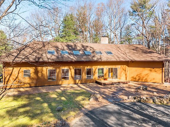 WOODHAVEN — a rare Mid-Century Modern sanctuary shaped around Light, Space, and Spirit. Centered on a dramatic two-story art studio, this one-of-a-kind home offers an open floor plan with soaring ceilings, a sun-drenched loft wrapped in windows, and solar-powered remote skylights that bathe the space in natural inspiration. A custom oversized fireplace and towering two-story brick chimney anchor the living, dining, and creative areas into one seamless experience where modern sophistication meets the warmth of organic wood and stone. Hand-cut wood floors and terra cotta tiles with geothermal radiant heat set a grounded, inviting tone, complemented by a handcrafted cherry-paneled library. Recent upgrades include a new roof with copper ducts and vents, Trane 5-ton heat pump, Norwegian pine deck, loft patio and floating front porch, full exterior stain, complete interior paint, refreshed primary and basement baths, and septic inspection. Perfect for artists, designers, wellness practitioners, photographers, or any home-based professional seeking abundant natural light and true creative freedom, ModernWoodhaven is not just a home—it’s a retreat, a studio, and a living work of art.