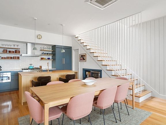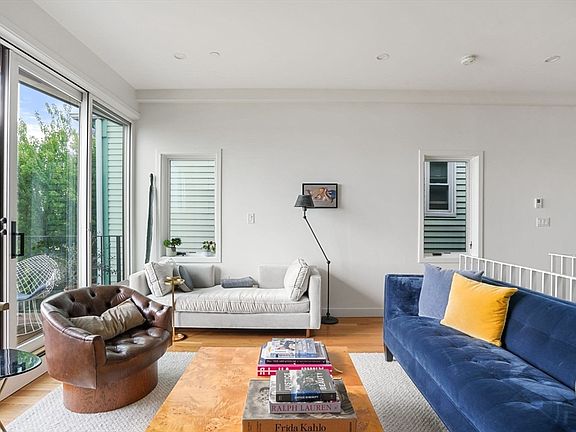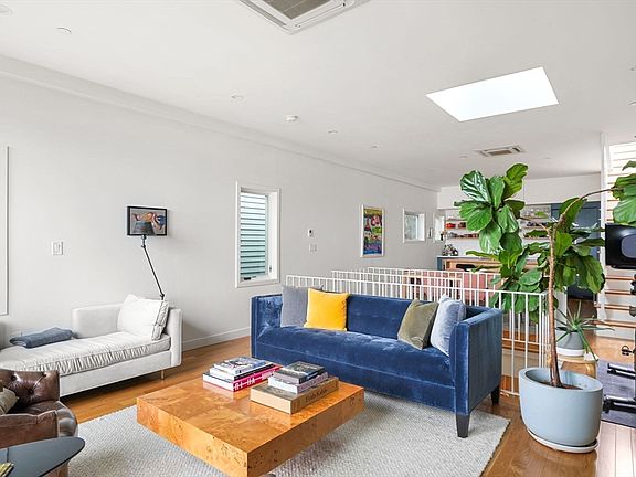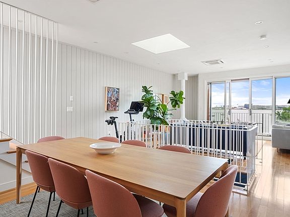This waterfront duplex has two floors of living with direct water and city views. It features an architecturally designed interior with custom details and woodworking throughout. In the main bedroom, behind a wall of oak panel doors, is a hidden custom walk-through closet leading to a shiplap clad bathroom with a generous soaking tub, shower, and double vanity. The front room, contains a state of the art home-theater; built-in desk, and custom hand-painted de Gournay wall installation. Climb the center stairs to the top floor to incredible ocean and city views. The kitchen features a premier six-burner range with matching appliances, panelized French Door fridge, floating shelving, walk-in pantry, and oak butcher-block island next to the dining area. The living room features a Malm gas stove, vertical shiplap walls, and a double glass sliding door with private deck. Upstairs the private roof-deck sits at the corner of the building, in prime position to gaze directly at the water.