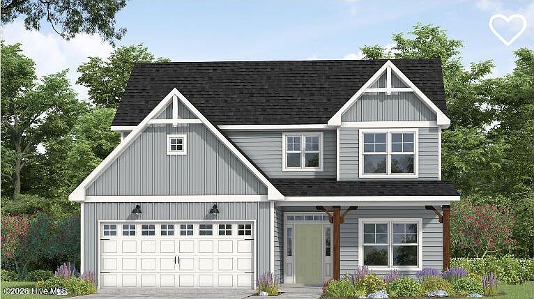 The Camelia plan features a formal dining room off the foyer, painted in SW ''Naval'', with a coffered ceiling and wainscotting accents. A laundry room, with cabinetry and stacked washer/dryer hookups, sits near the garage entry, next to a convenient half-bath. The kitchen offers ''New Willow White'' quartz countertops, white shaker cabinets, ceramic tile backsplash, bar seating, a pantry, and stainless steel appliances. The open great room includes a gas log fireplace with a decorative mantel and black granite surround, and access to the rear covered porch. The first-floor primary suite features a tray ceiling with crown molding and an en-suite bath with a walk-in closet, dual quartz sink vanity in ''Admiral Blue'' with a center drawer stack, walk-in tile shower, linen closet, and private water closet. Upstairs, a loft connects to three additional bedrooms, a laundry room, a linen closet, and full bath with a white vanity and tub/shower combination. LVP flooring runs throughout the main living areas. Exterior showcases vinyl siding with board and batten accents, dimensional roof shingles, and a front door in SW ''Pineapple Cream'' with smart keypad entry. Additional features include a two-car garage, Energy Plus Certification, fiber optic internet availability, and a 1-2-10 builder in-house warranty.