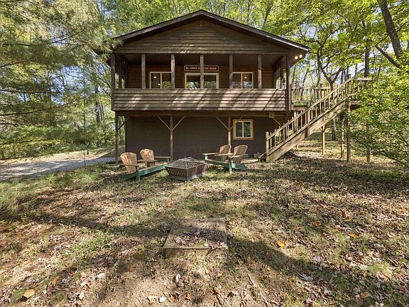 Cedar-sided 2BR/2BA Raised Ranch in Hide-A-Way Hills! This open-concept cabin features vaulted ceilings, abundant natural light, and a primary suite with oversized soaking tub. Spiral staircase and nearly an acre on 2 lots. Major updates include new windows, patio door, roof, gutters/guards, propane furnace, central A/C, water heater, softener, LVP floors, updated lighting/ceiling fans and a remodeled kitchen with quartz counters, SS appliances, backsplash & pantry. Relax & entertain on covered porch or side deck. 2-car garage with office/bonus space with decorative Fireplace & utility room plus whole-house fan. Enjoy lakes, pool, tennis, golf, dining & more in scenic Hide Away Hills!