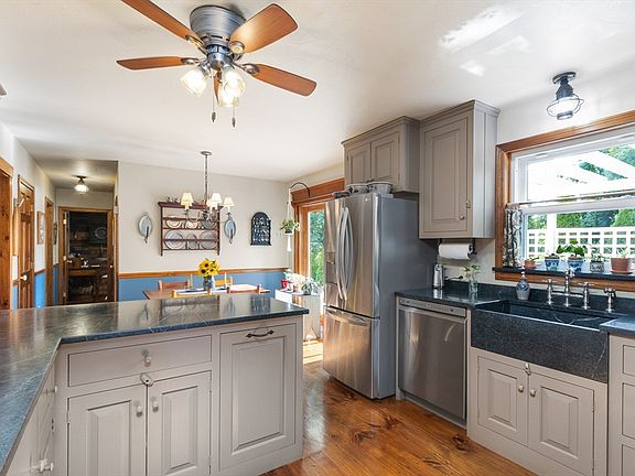 Beautifully maintained expandable Cape-style home is ready for new owners! If you are looking for custom design and attention to detail, here it is! The kitchen, complete with custom-built inset cabinetry, striking Soapstone counters and integrated farmer sink. The wide-pine floors throughout create a warm and timeless atmosphere and a slider to the deck brings in great sunlight. The main bedroom boasts double closets. Don’t miss the unique wood wall in the second bedroom. The bright living room has a gas fireplace and refinished stairs to the second level which could be finished into a bedroom or living area. Full bath has Corian countertops and antiqued vanity. The basement is finished in a lodge style with a bar area and wood stove. New septic being installed. Backyard will be graded and seeded prior to close. Yard has established plantings, garden and storage shed. Close to major routes, just over Charlton line! Come check it out!