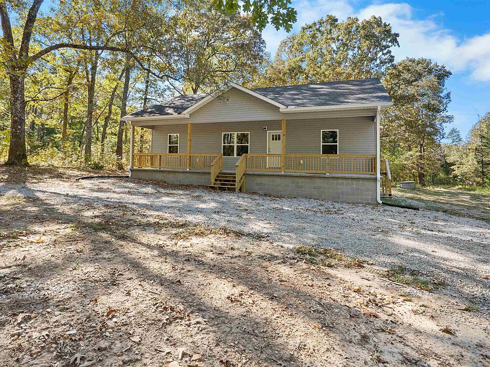 New construction tucked away on 3 peaceful, wooded acres. This modern 3-bedroom, 2-bath home offers an open floor plan with stylish finishes, 9ft ceilings throughout, and large windows that bring in natural light! Enjoy a spacious kitchen with stainless steel appliances, beautiful cabinetry, & quartz countertops. The primary suite has an attached full bathroom with a large walk-in closet. This energy-efficient home has a large concreted front and back porch, private well, circle drive, & located on a paved road! Call today to schedule a showing!