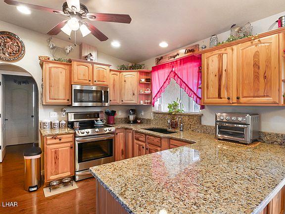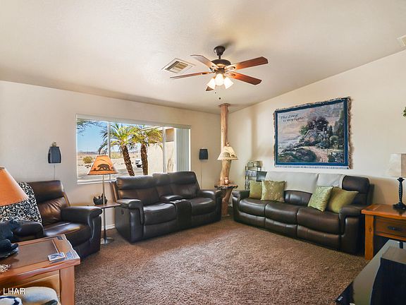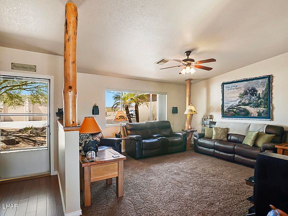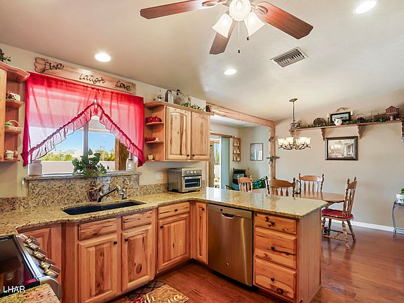 Rustic charm meets modern comfort in this 4 bed, 2 bath home is tucked at the end of a cul-de-sac with direct BLM access—ideal for off-roading right from your backyard. Enjoy stunning lake and desert views from your landscaped ¼-acre lot with a custom waterfall and room to add a pool, RV garage, or casita. Inside features include hickory soft-close cabinets, granite counters, and an open layout perfect for gatherings. 3 bedrooms have walk-in closets and one free standing closet. Permitted dining expansion adds flow. Oversized garage door (7'6' x 16'). Built with 2x6 construction, dual-pane low-E windows, and fully remodeled in 2010. Just 4.4 miles from the boat ramp. Recent updates: A/C (2018) still under warranty, appliances (2019), and solar hot water heater in 2025. Furniture available for purchase outside of escrow. For a full list of items contact agent.