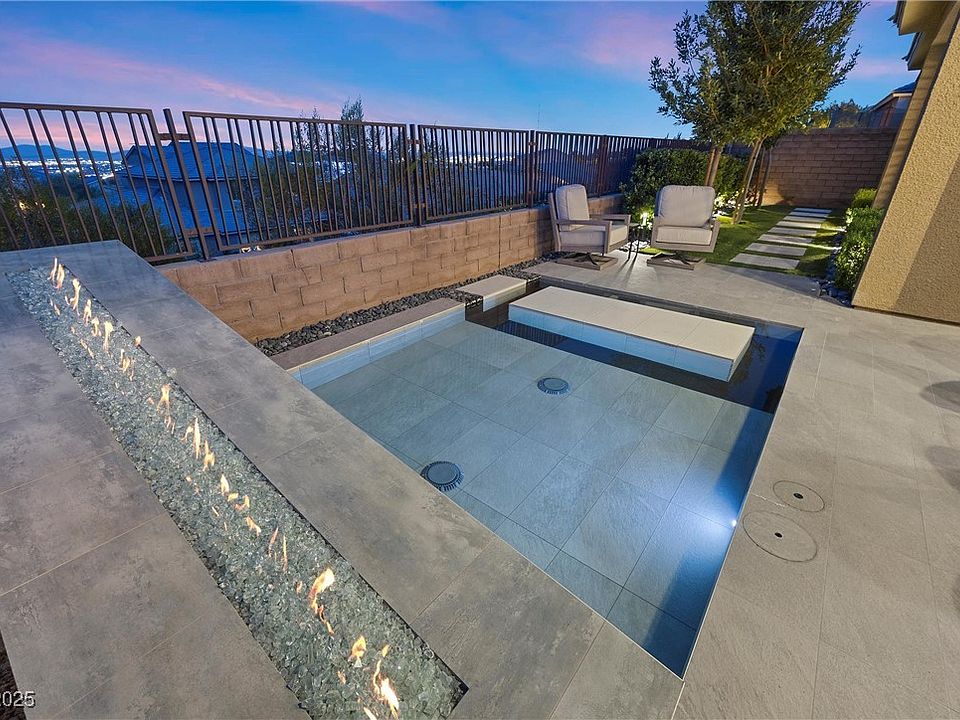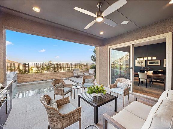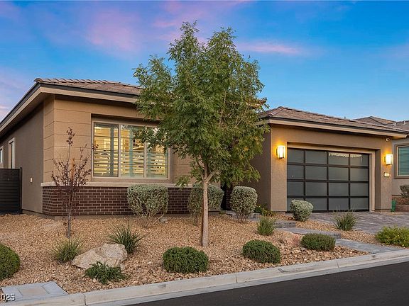 Welcome to this exquisite home in the exclusive, guard-gated community of Reverence in the heart of Summerlin. This stunning property offers an open floor plan and a seamless indoor/outdoor living experience. Enjoy breathtaking mountain and partial Strip views from your private backyard oasis, complete with a beautiful water feature that doubles as a dipping pool, waterfall, fire bar and outdoor kitchen. The upgraded kitchen offers quartz countertops, wine fridge, and top-of-the-line stainless steel appliances. The master suite boasts a luxurious upgraded shower, providing a spa-like experience and custom closet. A unique obscured glass garage door leads to the 3 car tandem garage. Extra amenities include sliding doors, shutters and new floors. This sought-after community offers world-class amenities, inc. a 16,000 sq. ft. clubhouse, fitness center, lap pool, beach-entry pool, cabanas, pickleball courts, and a fire pit with sweeping views of the Strip. Don't miss this amazing home!