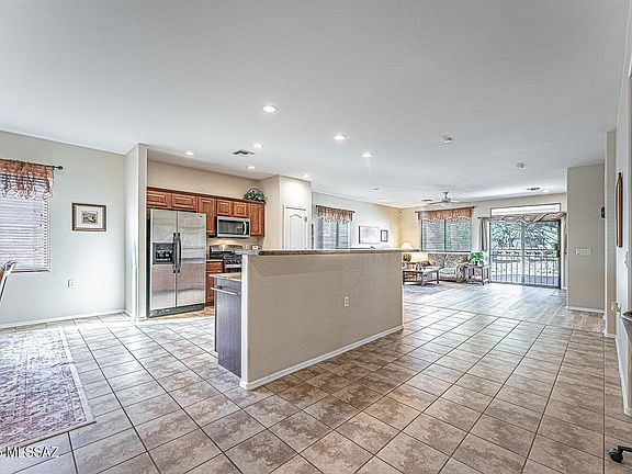 Gorgeous Corner-Lot Home with Contemporary Open Floorplan!. This beautiful 3-bedroom, 2-bathroom home offers a modern open layout designed for today's lifestyle. Ideally positioned on a corner lot with only one direct neighbor, it provides exceptional privacy and tranquility. The heart of the home -- the kitchen -- includes granite countertops, rich cherry cabinets with pullouts, stainless steel appliances, and an expansive breakfast bar that flows seamlessly into the great room and adjoining dining area. The inviting great room, highlighted by a cozy gas fireplace, opens directly to the backyard through sliding glass doors--perfect for indoor-outdoor living. The spacious primary suite serves as a serene retreat with a walk-in closet and an elegant en suite bath featuring executive-height double vanities and a walk-in shower. The split floor plan ensures privacy for guests, and the versatile third bedroom easily doubles as an office, hobby room, or guest space. Relax and enjoy the beautifully landscaped backyard with pavers, an extended covered patio, mature plants, and a tranquil water feature. Additional highlights include tile and laminated wood flooring, a water softener loop, attractive wrought-iron security doors, ceiling fans in all bedrooms, and a fully equipped laundry room with washer and dryer included. Experience an active lifestyle that the Green Valley recreation membership offers - pools, gyms, pickleball courts, classes, entertainment, and shows. Perfectly situated, the home is just a stone's throw from the Torres Blancas Golf course and the renowned Anza Trail along the Santa Cruz River - a paradise for outdoor enthusiasts. Additionally, the I-19th and shopping area are conveniently accessible. All around a great home that you can not miss!