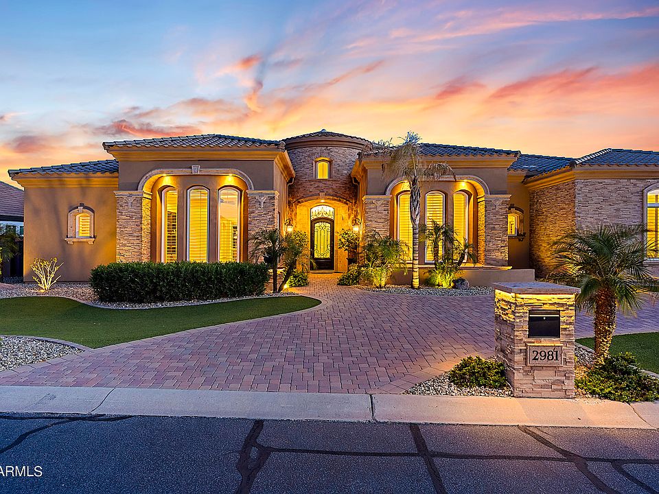 Step into luxury at Whitewing at Higley in Gilbert, AZ. A breathtaking 10' custom iron door welcomes you to a stunning 20' dome ceiling lit by elegant cove lighting. This custom home boasts Travertine floors, a chef's kitchen with two-tone cabinets, granite countertops, and high-end Thermador appliances. Enjoy the oversized island, a hidden walk-in pantry, and a charming breakfast nook under a brick dome ceiling. The great room features a Canterra gas fireplace, perfect for cozy evenings. A walk-out basement offers two full bedrooms, baths, and a kitchenette, ideal for guests or entertainment. Step into the expansive primary suite of your luxury home, where every detail is crafted for your comfort and sophistication. Motorized roller blinds, dual reading lights, and cove lighting create the perfect ambiance that leads to the primary bath that is a masterpiece with marble counters, dual vanities, a steam shower, and a soaking tub illuminated by a Savoy House chandelier. The customized walk-in closet features a built-in safe, bench, and an island with granite. And for the professionals, bedroom 5 serves as an executive office, complete with wall-to-wall bookcases and a coffered ceiling. Featuring 4.5 baths with frameless showers, a deep soaker tub, glass tile, and travertine finishes. Vessel sinks along with undermount sinks to add elegance. The laundry room is of royal status: Monte Cristo granite, glass tile backsplash and a vast array of cabinets that include a large desk area and walk-in closet! Your ultimate outdoor entertainment awaits. Enjoy year-round gatherings under a vast patio with Scabos pavers, a misting system, and views of a lush backyard. Breathtaking negative edge Pebble Tec Pool with enchanting water features and a fogging system, surrounded by professional landscaping. Relish evenings by the round gas fire feature all while grilling on the built in BBQ. Walk over to the versatile pool house, equipped with epoxy flooring and electricity. A haven where every detail caters to a lavish lifestyle. The side load garage boasts a Tesla EV charger, 18 foot garage door openers for a 4.5 garage. Epoxy flooring, 25' built in cabinets with 5' Workbench. Sonos Amps for all in-ceiling speakers, Swannview 8 exterior security cameras, eufy doorbell. Unparalleled luxury living in this dream home!
