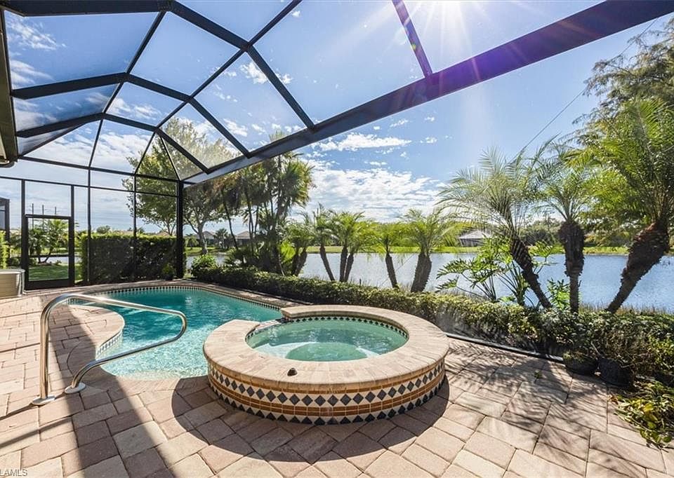 Experience resort-style living in this stunning lakefront pool home featuring the desirable Anna floor plan with 3 bedrooms + den, 3 bathrooms, and 2,020 sq. ft. of well-designed living space. The home offers a spacious great room layout with 8 ft. doors, soaring ceilings, a gourmet kitchen with granite counters, 42" soft-close cabinetry, large center island, and stainless steel appliances. Positioned on a premier pie-shaped lot, this home offers exceptional privacy and western exposure. The screened lanai is the perfect place to unwind, with a newly added outdoor kitchen with a spacious sitting area, a gas-heated pool and spa, and panoramic lake and golf course views that deliver spectacular sunsets every evening. The lanai is equipped with automatic storm shutters for peace of mind. The luxurious primary suite is a true retreat with stunning lake views, dual vanities, granite counters, a large walk-in shower, soaking tub, and two oversized walk-in closets. Located in the gated Verandah community, residents enjoy a wealth of amenities including 36 holes of championship golf, tennis, a resort-style pool, fitness center, kayaking, biking/walking trails, dining, and more. Don’t miss this opportunity to own a private retreat with luxury finishes, breathtaking views, and an unbeatable lifestyle.
