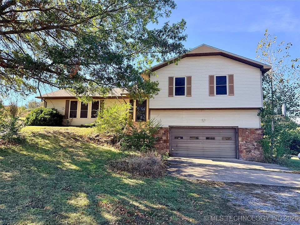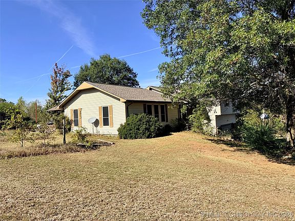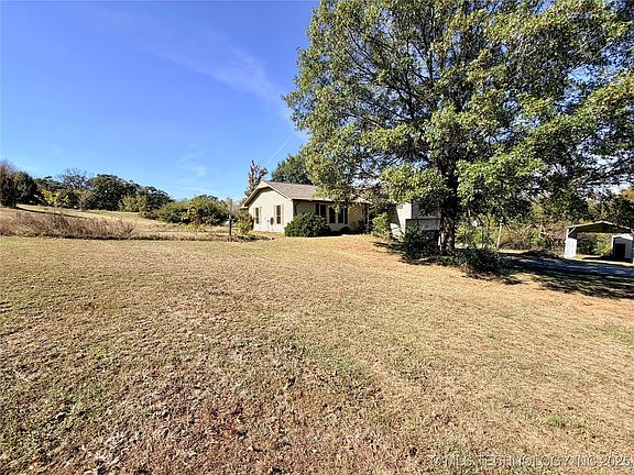Enjoy peaceful country living with this spacious tri-level home on 4.95 acres (m/l) just outside of Henryetta city limits. 3 bedroom, 2.5 bath PLUS full basement for guests and storm shelter area. First level is 2 car attached garage, basement, separate laundry room with 1/2 bathroom, and office/second living area. Middle level with front door has the primary living room with built in cabinetry, formal dining room and bar, updated kitchen with island, granite countertops, abundant cabinetry, and all appliances included. Next level up has 3 bedrooms and 2 full bathrooms. Primary bedroom offers private deck, walk-in closet, and jacuzzi tub with separate shower. Vinyl windows, luxury vinyl flooring, and tile bathrooms. Detached shop with electric overhead door, two carports, RV hookups, and pond to fish. Roof replaced approximately 2 years ago. Peaceful country setting on a paved road that you do not want to miss out on!