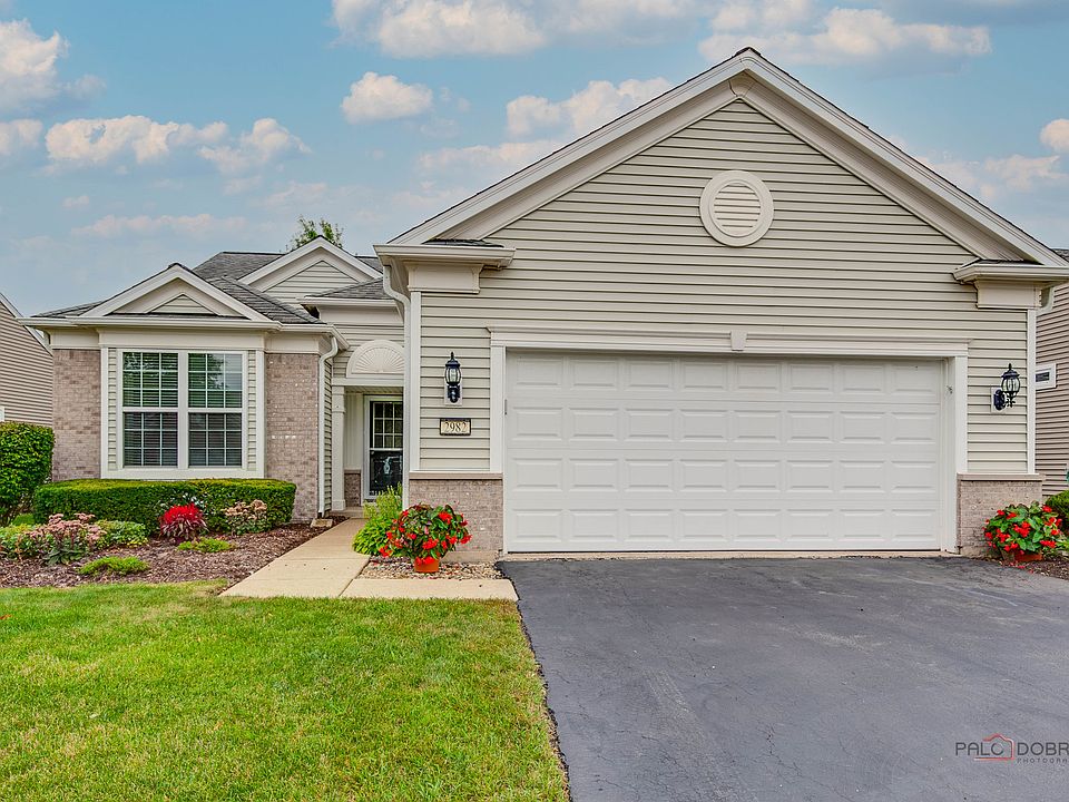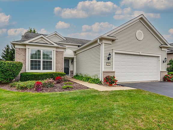 Neutral & bright Grand Dominion ranch! Quality finishes include brick front, vinyl Siding, and 'level 2-car wide driveway". The interior features no stairs, wide doorways and an open Floor Plan design. There is neutral ceramic tile flooring in the kitchen and bathrooms, white 6-panel doors and trim. The kitchen has lots of counterspace, a kitchen island and eating-area perfect for daily living. The kitchen also opens to the sunroom, a perfect area for enjoying a quiet space or perhaps your favorite TV show. The sunroom also leads to your own private patio through glass sliding doors. The home features recessed lights (can lighting), large vinyl double hung windows with Plantation window blinds. Spacious living/dining combo! You'll love the Glass French doors which lead to a private Study (or 3rd Bedroom)! Master suite boasts huge walk-in closet & luxury bath ensuite; dual sinks, whirlpool tub (with jets) & separate ceramic tile shower with glass doors! South-facing backyard w/mature trees! The cement patio also has a built-in gas line for summer grilling. 55+ community offers a clubhouse, pool, tennis & more! The Expanded Bennett Model features a sunroom and the extended garage (additional 4' x width of the garage - in length). Full-size laundry room with full-size Maytag appliances. For more, see the Detailed Feature Sheet (under Disclosures). Brand New carpeting has been installed as of 9-22-2025. Seller is willing to give a $3,500 credit to the buyer at Closing for appliances. Make time to see this lovely home.