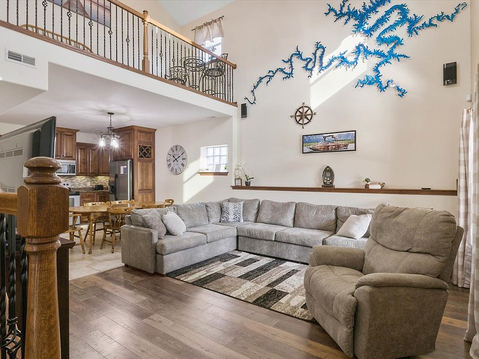 The heart of this home is its open concept design, featuring high vaulted ceilings and a custom-built kitchen with exquisite cabinets, perfect for culinary enthusiasts and entertainers alike.