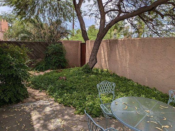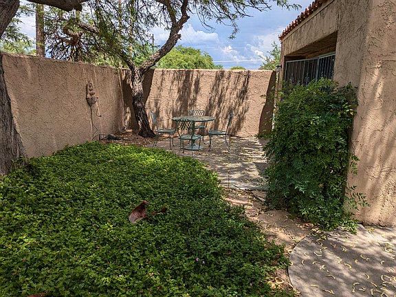Clean and neat Townhouse in the Winterhaven area of Tucson. This end unit single story townhome has a lot of natural light and vaulted beamed ceilings as well as a very spacious open concept living area with a split bedroom floorplan. There are 2 bedrooms with large wall to wall closets and 2 bathrooms, the on-suite primary having a tile shower with bench. Also includes large in unit washer / dryer. It also has a fenced private mini backyard with two patios. The kitchen features stainless steel appliances that are new from 2022 including a quiet Bosch dishwasher. Less than 2 miles to the Campbell Corridor, La Encantada - 5 miles, Tucson Tennis & Raquet club and Rillito River Walk are also within 1 mile. Community Pool & Spa & BBQs are right across the street. 2 car private carport with available EV charging.