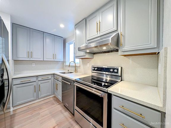 The remodeled kitchen has stainless steel appliances, including an electric stove with hood, refrigerator and dishwasher. Lots of cabinets and counter space.
