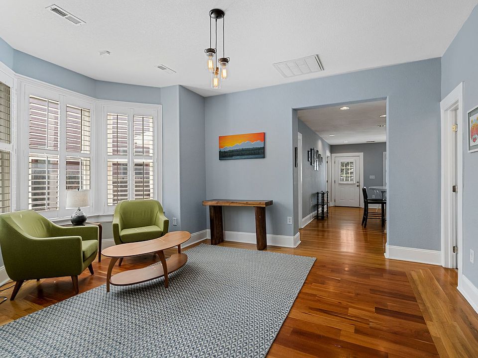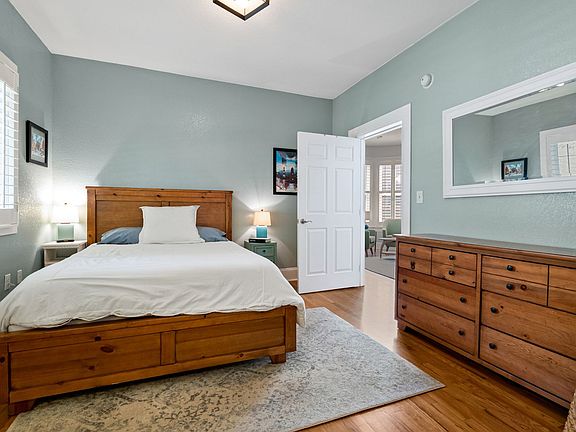 Welcome to this beautiful home filled with character and modern touches. Step inside from the stamped concrete walkway to find wood floors and plantation shutters throughout. The bright living room features a bay window that brings in plenty of natural light.