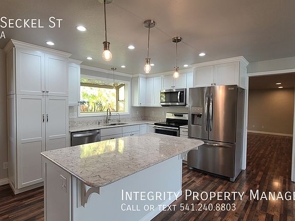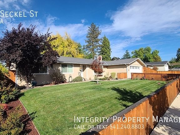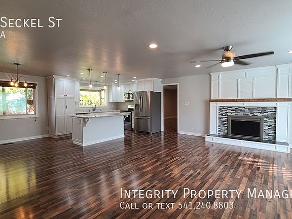This beautifully updated 4-bedroom, 2.5-bath home offers modern comfort just blocks from Rogue Regional Medical Center. Step inside to an open-concept living area featuring rich wood-style LVP flooring, recessed lighting, and a stunning custom fireplace with a tile surround. The kitchen boasts spacious countertops, stainless steel appliances, and a large island perfect for entertaining. Each room is filled with natural light from the home's large windows and sliding glass doors, leading to a private, fully fenced backyard shaded by mature treesideal for relaxing or gatherings. With an attached garage, beautifully landscaped yard with lawn care maintenance included, and a quiet, well-kept neighborhood, this home combines convenience, charm, and style in a prime Medford location.