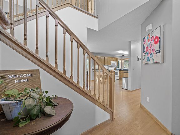 Discover an exceptional opportunity with this stunning home in a coveted location! The open floor plan features vaulted ceilings and abundant natural light, creating an airy atmosphere. The living room has over-sized windows and a cozy gas fireplace. Enjoy a kitchen with ample space and storage, including a walk-in pantry. The connected sunroom is perfect for dining or relaxing, or step outside to the wrap-around stamped-concrete patio. Three bedrooms are on the upper level, while the lower level has a fourth bedroom, currently a flex office and guest room. The property boasts a private fenced yard with mature trees and a garden. A mudroom with a large closet leads to a three-car garage and a matching backyard shed. Situated in an amazing neighborhood, this home connects via bike path to local favorites including a brewery, restaurants, and Blaine's upcoming minor league baseball stadium. It's ideal for commuting into the city. Only the seller's relocation gives you the chance to make this cherished home your own!