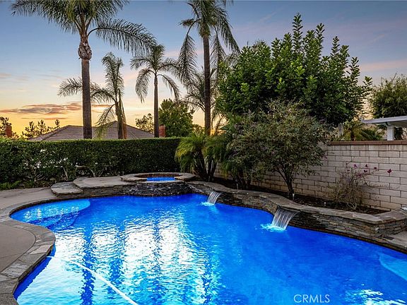 Stunning single-story pool home, completely remodeled, in the gated Emerald Ridge at Live Oak community. The front yard is meticulously landscaped with lawn and manicured planters, carriage-style garage doors, and a herringbone brick walkway leading to a covered front porch. Inside, the living room anchors an open layout and features light oak-style LVP flooring, high vaulted ceilings, plantation-shuttered windows facing the front yard, and a brick fireplace with a white mantel. An adjacent dining room includes a chandelier and its own shuttered window overlooking the side yard. The remodeled kitchen offers white cabinetry, quartz countertops, a full tiled backsplash, recessed lighting, and a center island with countertop seating; GE Profile appliances include a convection oven, microwave, 36" gas cooktop, dishwasher, and refrigerator. The kitchen opens to the family room, which has vaulted ceilings, windows, and a shuttered sliding door to the backyard. A hallway with ample storage leads to the primary bedroom with vaulted ceilings, a ceiling fan, a walk-in closet, and a slider that frames the backyard and provides easy access. The primary bath features new cabinetry with quartz countertops, dual sinks, a walk-in shower, and a separate tub. Two additional bedrooms offer vaulted ceilings, shuttered windows, and spacious closets, served by a remodeled hall bath. A dedicated laundry room provides storage and a door to the side yard. The attached three-car garage includes extensive built-ins and rafter storage. The backyard showcases a pebble-finish pool and spa with a stepped-stone spillway and stone coping, a built-in barbecue with counter seating, stacked-stone accents that carry into raised planters, a fire pit, perimeter privacy hedges, mature trees, and a grass area. A wrought-iron rear fence affords neighborhood and hillside views with light trimming. Additional upgrades include: dual paned windows and sliding doors, new garage doors, and ducting throughout. Remodeled single-story homes in this community are rare, don’t let this one pass you by.