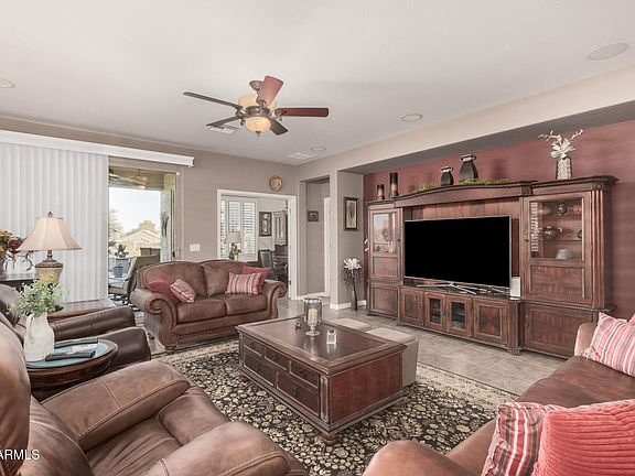 FULLY FURNISHED GOLF COURSE LOT Situated on the 17th hole tee box, this truly immaculate home is better than new. Quality furnishing, neutral tones, and plantation shutters throughout. The kitchen features stainless steel appliances, solid-surface countertops, staggered cabinetry and breakfast nook. Spacious great room with media niche, surround sound near the double doored den. The master suite offers dual sinks, a soaking tub, separate shower and large walk-in closet. Enjoy outdoor living with a covered patio, built-in firepit and lush desert landscaping all with sunrise views over the golf course. Extended garage includes custom cabinetry, workbench, and utility sink. Gated community with club house, pools, tennis and pickleball courts, parks and walking trails.
