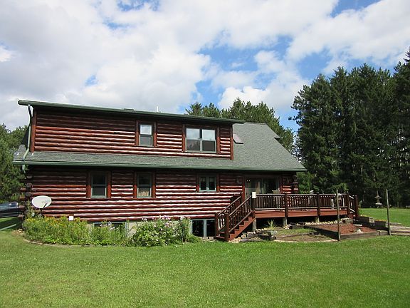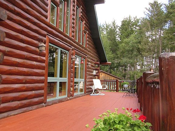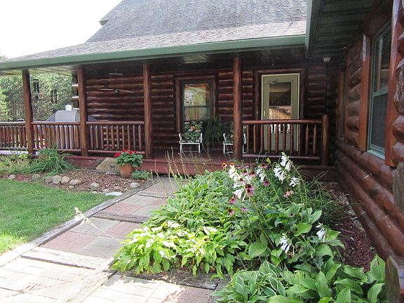 This beautiful, rustic log home is situated on 10 acres, perfectly located just far enough from town that you can enjoy it for the retreat that it really is! This 3-bedroom, 2 bath home has two bedrooms on the main level along with main floor laundry. The master suite has a luxurious whirlpool tub, walk-in closet, and attached loft area which overlooks the great room offering beautiful 21' vaulted ceilings.A beautiful stone gas fireplace is the focal point of the great room where you can look out onto your wrap-around porch and large fire pit. Want more? You may take your daily walk along a secluded walkway around much of the property's perimeter, enjoying much of the wildlife that inhabits your property. Custom kitchen cabinets, a nearly new gas stove/oven and built-in microwave with a large island filled with extra storage make this kitchen a dream-come-true! In addition, this woodland home has a 2+ attached garage, and a heated 28 x 38 detached workshop! And an additional carport (12 x 30) to store all your toys. The full basement has room for storage and could easily be finished for additional living space.