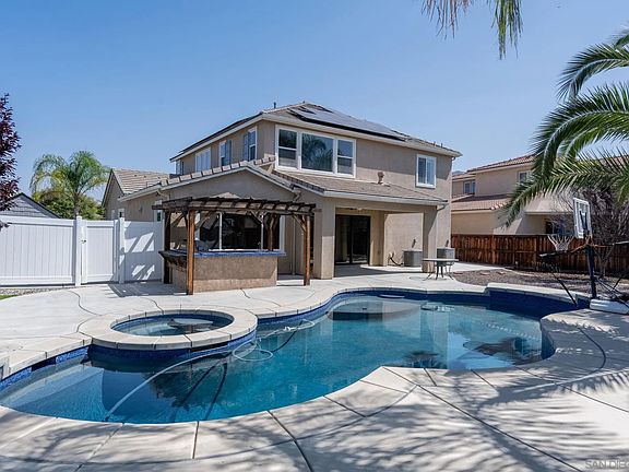 This stunning detached single-family home nestled in the sought-after Heritage Lake neighborhood. This residence provides the perfect blend of luxury and comfort, offering four bedrooms with the flexibility of an optional fifth, and three full bathrooms. The home's design is beautifully accentuated by wood flooring throughout, adding warmth and elegance to each room. The expansive family room and kitchen combo is the heart of this home, featuring a cozy fireplace that adds to the inviting ambiance. The kitchen is a chef's delight, equipped with granite counters and stainless steel appliances, offering both style and functionality. One bedroom and a full bathroom are conveniently located on the first level, ideal for guests or multigenerational living. The large primary bedroom upstairs provides a tranquil retreat with ample space for relaxation. Additional highlights include a laundry room located upstairs for convenience, and a 3-car tandem attached garage. The home is equipped with solar panels, offering energy efficiency, and a large gated side yard with a storage shed provides extra space for your needs. The cantina doors open up to a spacious backyard, creating an ideal setting for both indoor and outdoor living. This outdoor oasis includes a sparkling pool and spa, perfect for relaxation and entertainment. The outdoor kitchen is fully equipped with a built-in BBQ, drink fridge, and sink, making it a dream space for hosting gatherings. The exterior is beautifully landscaped with lush palm trees, creating a tropical paradise right in your backyard. Heritage Lake is renowned for its community spirit and amenities, providing residents with a perfect blend of peaceful living and modern conveniences. Located within close proximity to a variety of dining options, excellent schools, and shopping destinations, this home offers convenient access to everything you need. Heritage Lake is the ideal neighborhood for those seeking a vibrant community with easy connectivity to surrounding areas.