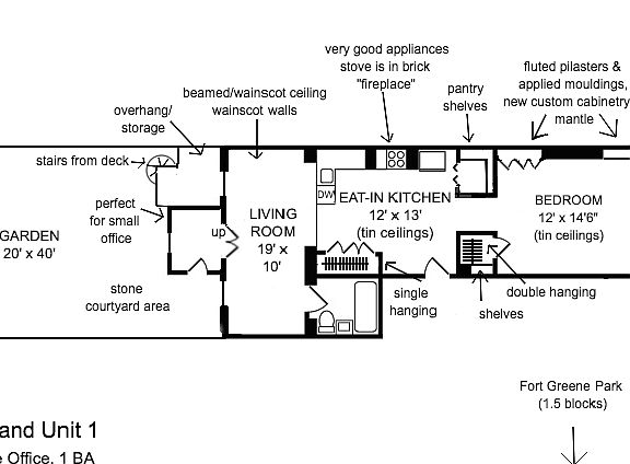The heart of Fort Greene is the perfect neighborhood in NYC, and this full-floor 1BR, bursting with character and historic appeal, is the perfect spot in it. The bedroom fits a king bed easily and features custom shelving, a marble fireplace and a walk-in closet. It opens into a cozy open kitchen with new stainless steel dishwasher, stove, and a spacious pantry. The living room leads you into a small, windowed nook perfect for a home office overlooking perhaps the biggest selling point of all - an 800 sq. ft. patio and garden oasis the previous tenant poured her heart into.