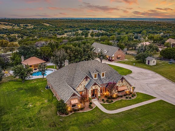 Silverado on the Brazos is the place to be in Parker County! This 3 plus acre property offers everything you could ask for: plus a guest house. The custom built 4 bedroom 3400 plus sqft 2 story home offers an easy to live-in floor plan a large game room with wet bar , and 2 wood burning fireplaces. The covered back porch overlooks the live oak shaded back yard and resort-like pool area . The backyard is built to entertain in grand style . The cabana offers an outdoor kitchen, large seating area, big screen TV, fireplace and outdoor game area. The recently built guest house is complimented by fully climate controlled garage offers a gym area, workshop , and plenty of space to entertain guests . The main house has a 3 car garage and the guest house has an additional slip for boat or RV storage . The property is pipe fenced and could easily be adapted to accommodate your livestock . If you are considering living in Silverado on the Brazos you must see this property .