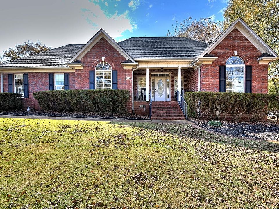 Welcome to the property that you’ve been searching for. This beautiful home has as much to offer outside as it does inside. Upon entering the home, you will see beautiful hardwood floors and a columned entry into the main living area. The vaulted ceilings and fireplace give you a “welcome home” feeling. The eat-in kitchen offers an island with lots of room for meal prep as well as an area for your breakfast table. A formal dining room complete with light dimming chandelier is ready for entertaining guests or special occasions. The desirable split-bedroom floorplan offers a generous primary suite with walk-in closet and large bathroom with a jacuzzi style tub. Two additional bedrooms provide ample space for guests. The spacious attic space gives lots of room for storage. Situated on a beautifully maintained .64 acre corner lot and cul-de-sac, this property boasts a wonderful view of Lake Blalock with lake access only eight minutes away. It includes a side-load garage, an uncovered walk-out deck perfect for relaxing or entertaining and a fenced-in backyard. Welcome home!