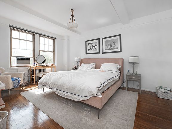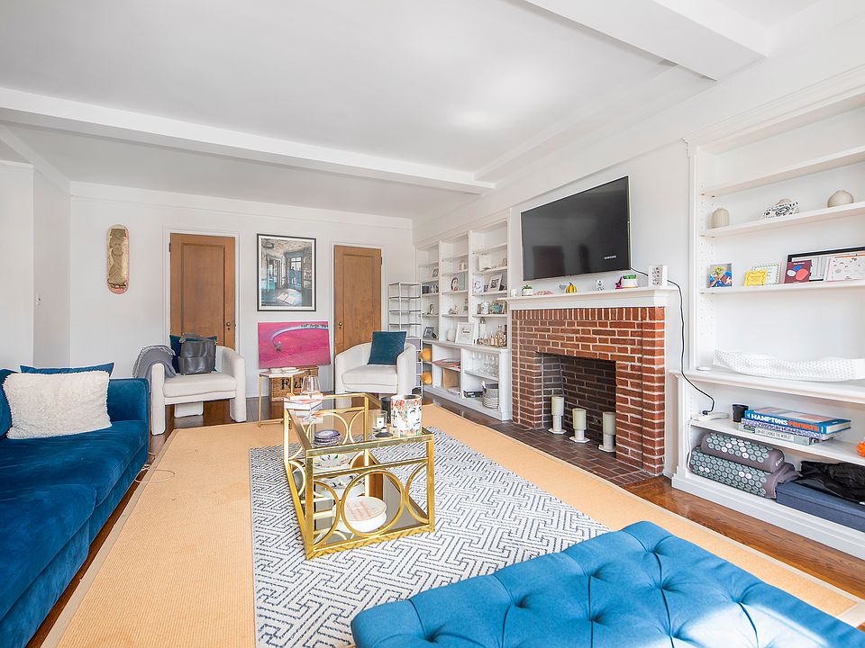 This prewar apartment features hardwood floors, beamed ceilings, windowed kitchen with Subzero fridge, decorative fireplace, and lots of closets (including one walk-in-closet).