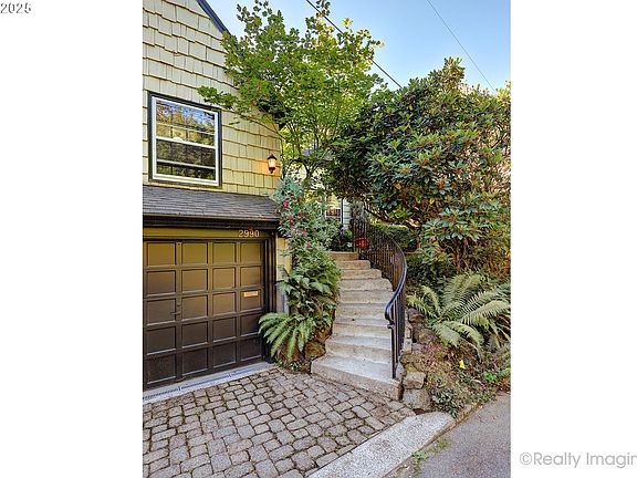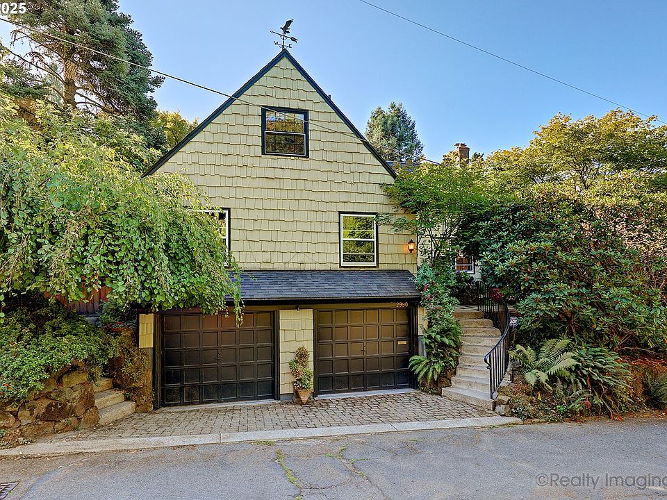 This 1941 charmer is nestled into a private oasis within Kings Heights! Offering the cozy, calming feel of a European vacation with three seperate outdoor areas, deck, stone patios and gardens. Just minutes to all NW 23rd / Alphabet District / Forest Park and Washington Park have to offer! Four generous sized bedrooms - two on the main and two spacious bedrooms, including the primary suite, upstairs. The living and dining rooms open to each other with incredible floor to ceiling wood windows that have been fully restored. Two wood burning fireplaces and two attached garages for parking. Plenty of storage throughout! Mechanical updates include newer gas furnace, electrical panel, water heater, rebuilt chimney, completely restored windows, new roof and fresh paint! [Home Energy Score = 1. HES Report at https://rpt.greenbuildingregistry.com/hes/OR10241535]