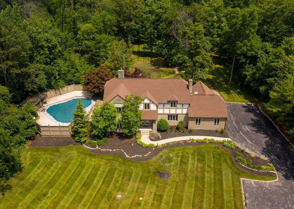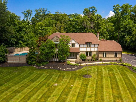 Unique opportunity to own your own prestigious retreat on 6.4 acres! Quality constructed home designed & built for the owner of a company. When the company sold the property became a corporate events retreat. The entry welcomes you with winding staircase & marble flooring. The 1st floor has a den, living rm, cozy family rm, 2 fireplaces, 2 half baths, & 2 dining spaces including the kitchen area with windows overlooking the grounds! Upstairs is the spacious owners suite, 4 additional bedrooms & 3 full baths. The lower level has another bedroom, full bath and multiple recreation areas. The home features an in-ground pool, bocce court, pond, gazebo, putting green, 3 car garage, 1st flr laundry, walkout bsmt, large deck & patio! Updating and maintenance will be needed to make this your own.