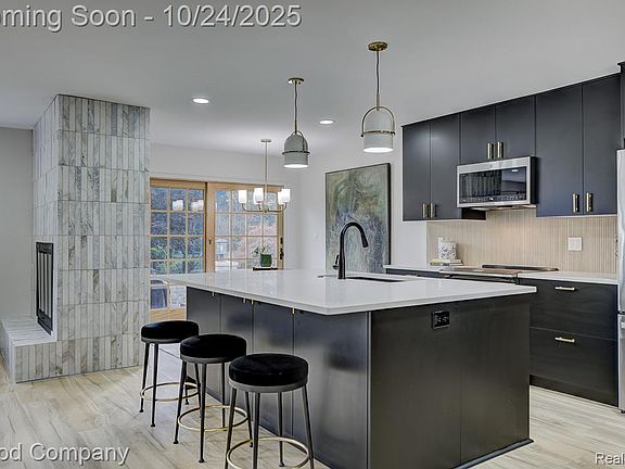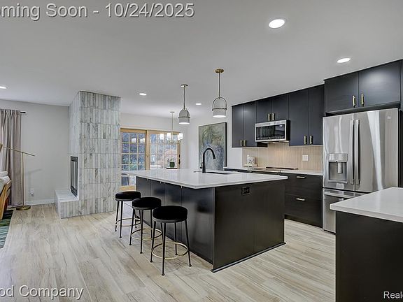 Matterport virtual walkthrough available on Homes. Beautiful brick ranch on a spacious corner lot in Troy featuring a stunning modern interior, private backyard, and an ideal location near Bloomfield Hills, Birmingham, and downtown Troy. Step onto the charming covered front porch surrounded by neat landscaping and into a light-filled open floor plan with sleek finishes throughout. The kitchen is a showstopper with a large center island, bar seating, stainless steel appliances, and stylish black cabinetry, flowing seamlessly into a cozy dining nook with sliding glass doors to the patio and a dual-sided fireplace shared with the inviting living room. The layout offers three generously sized bedrooms and two full baths, including a Jack and Jill bathroom connecting two of the rooms. An attached two-car garage currently functions as a home gym, while the partially finished basement includes a third full bath, wood-paneled walls, and plenty of storage space. The backyard is perfect for entertaining with a spacious patio, mature trees for added privacy, and a handy storage shed. Welcome Home!
