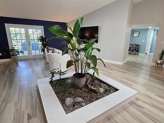 Welcome to this stunning 4-bedroom, 2-bathroom pool home in the highly sought-after Lake Valencia community in Palm Harbor. This home offers the perfect mix of modern style and relaxed Florida living. As you approach you will be greeted with new hurricane-impact solid wood doors. The spacious living area is filled with natural light from a skylight and features a tropical-style centerpiece that gives the space a warm, welcoming vibe. The real showstopper is the gourmet kitchen—designed for both cooking and entertaining. You'll love the Jenn-Air cooktop, waterfall quartz island, sleek designer cabinets, and pull-out pantry. There's also a wine chiller, ice maker, and a granite sink, along with plenty of counter space and a breakfast bar that opens to the large family room with a decorative fireplace and views of the pool. The split floor plan offers privacy, with the primary suite featuring a spa-like bathroom. Three more bedrooms give you plenty of options—whether for overnight guests, or a home office. The indoor laundry room includes a new quartz counter, sink, and stacked washer/dryer. Outside, you'll find your own private oasis with a screened-in pool area, outdoor shower, and plenty of space for entertaining, lounging or dining. The yard is beautifully landscaped with tropical plants, plus there’s a dog run for your furry friends. Other upgrades include: Remote-controlled shades in the family room as well as Plantation shutters throughout, Updated lighting and wiring, A/C (2021), Roof (2018), Hot Water Heater (2019). Lake Valencia is a quiet, deed-restricted neighborhood built around a peaceful lake, with a community play area and benches to enjoy the view. You're just minutes from top-rated schools, shopping, restaurants, beaches, and more. Not in the Flood Zone and no flood insurance required here. Don’t miss this move-in-ready home—it has everything you need to enjoy the Florida lifestyle!