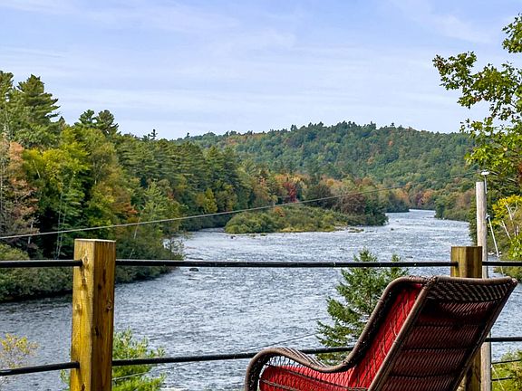 Introducing The Overlook — a stunning 3-bedroom, 3-bathroom custom post-and-beam retreat perfectly positioned on 1.38 acres high above the Dead River. Built in 2019, this exceptional home combines timeless craftsmanship with Maine's natural beauty, offering unmatched panoramic views that stretch both north and south along the river's winding bends and the breathtaking Scenic Route 201. From dawn to dusk, nature puts on a show—culminating in remarkable sunsets that paint the sky with vibrant color, best enjoyed from the expansive deck or through the home's large picture windows. Inside, handcrafted red cherry cabinetry and built-ins showcase true artisan detail, while a striking wood-burning fireplace anchors the open-concept living area. The private upper-level primary suite provides a serene escape with an ensuite bath and sweeping river views. A separate guest suite offers comfort and privacy for friends or family, while the versatile bonus room is ideal for an office, hobby space, or playroom. The two-car basement garage offers abundant storage and the potential to create your dream workshop or wine cellar.