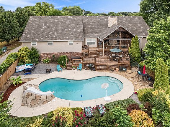 Original custom built home on three wooded acres that provides amble amount of privacy. Immerse yourself in this very highly functional three level home, which features; several entertaining spaces, vaulted ceilings, wood burning fireplace, as well as an additional electric log fireplaces, game room with wet bar, in-ground salt water pool with slide, that ranges between 4 to 9ft, pool bath attached to lower garage, covered back deck that overlooks the pool and the serene nature of the woods, wood burning fire pit. The Primary on-suite offers dual closets & vanities, walk-in tile shower, jetted Jacuzzi. Each of the five bedrooms adjoins a full bath. Whether your interest include, swimming, relaxing, the warmth of the fire, mixology, grilling out, entertaining friends & family, relaxing in the jetted tub, & much more, this home features it all. The downstairs basement can also function as a mother-in-Law Suite. Come experience this high entertaining, yet relaxing retreat like home in Pea Ridge.