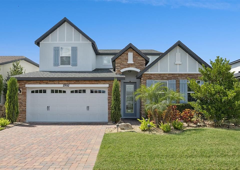 This residence is located in the peaceful St. Cloud neighborhood of Oakley Place. With a limited number of surrounding homes and its stunning curb appeal, inspired by French Country and English Tudor architecture, this home offers a quant and welcoming experience from the moment you arrive. Meticulously maintained, the main living space is defined by an open floor plan with high ceilings, creating a bright and expansive atmosphere. The generous dining room greats guests, upon entry, and leads to the Chef's kitchen with an oversized island, built-in double oven, glass cook top and a large walk-in pantry. The owner's suite is also located on the first floor and features private access to the backyard, two ample closets and a spa-like bath retreat with an expanded shower, double vanity and private water closet. An upgraded, decorative stair railing sets the tone for the second floor, which offers a convenient home office niche and loft, both surrounded by the additional three bedrooms and two baths. Additional features include a first-floor laundry room and a powder bath, covered lanai, and 2-car garage with flex tile, storage cabinets and bicycle racks.