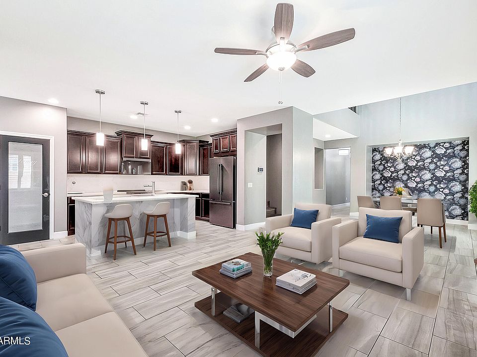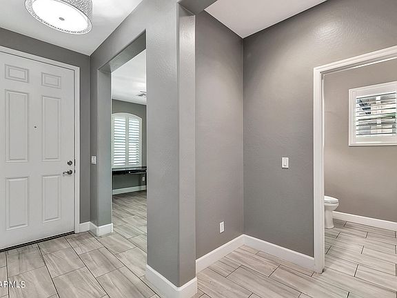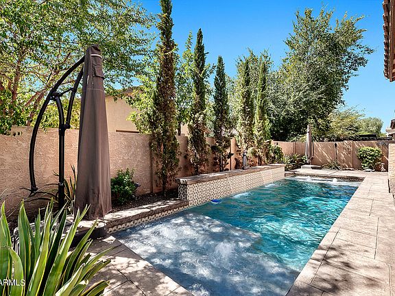 STUNNING! 5 bed/4 Bath+Loft +Downstairs Den. Designer Upgrades, Resort-Style Yard. No Expense Spared! Plantation Shutters Throughout, Newer Flooring/Int. Paint, Main Floor Bedroom w/Ensuite Bath for Guests. Spacious Floorplan with Tall Ceilings & Clerestory Windows. Kitchen w/Quartz Counters, Island, Pantry, NEW BOSCH APPLIANCES! Enormous Loft and Main Bedroom w/Retreat Area large enough for office, Custom Cal. Closets. Additional 3 Beds up w/hall bath & Juliette Balcony. Are you ready for this yard? High End PebbleTec Pool with LED Changeable Lights, 2 Cascade Waterfalls, Stamped Concrete Patio, side yard with Syn. Grass. TRANE HVAC Unit w/Nest Thermo., Gar. Door WIFI connect, Spray Foam in Attic. North/South Lot near Pocket Park, 3 Community Pools, Low HOA and close to Gilbert Amenities
