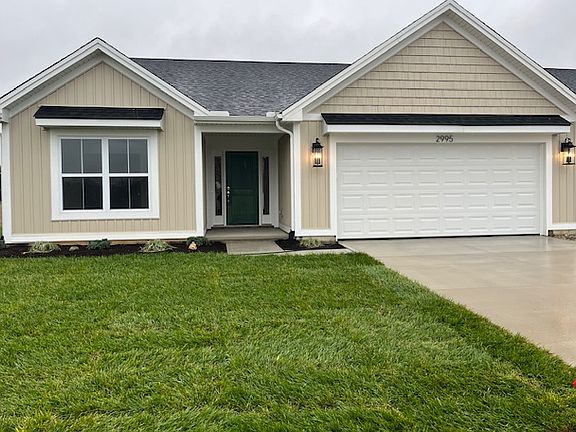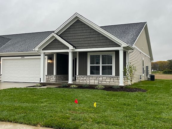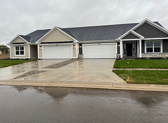 Beautiful new duplex with soaring 10' ceiling in the living areas and 9' ceiling in the remaining areas. Great floor plan. Deluxe LVP thru the living areas and carpet in the bedroom. Ceramic Tile in 2 bathrooms. Can lighting. Super kitchen with loads of cabinetry, quartz countertops, stainless steel appliances, pantry unit, and 10' peninsula with seating! Dining areas with sliding door to the private patio. Loads of natural light. Laundry room with upper cabinetry and closet area. Owners suite with cathedral ceiling, ceiling fan, walk-in closet. Owners bath: double sinks, oversized shower, linen closet. Additional 2 bedrms and one w/ ceiling fans. Hall bathroom/another linen closet. Covered front porch. Foyer offers huge closet. 2 car garage w/openers. Lawn and landscaping is taken care of! Gas Heat! City Utilities. Brand new community.