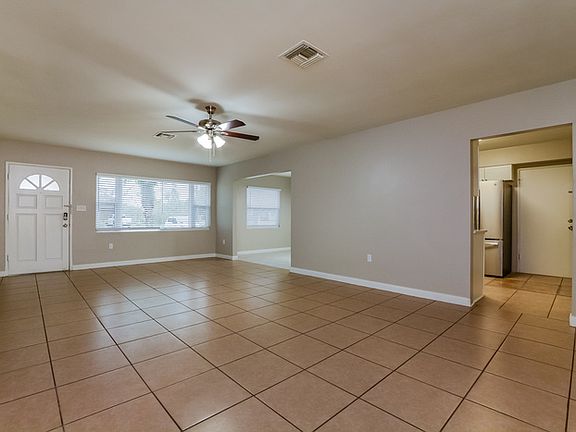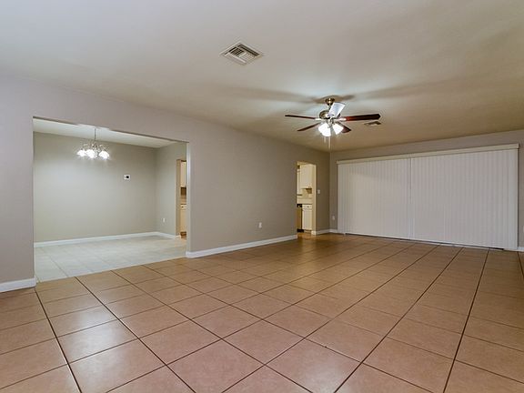 The main living area features tile flooring and an expansive layout that opens to the dining room and kitchen. Large windows help brighten each space, and the neutral tones create a clean, adaptable foundation throughout. The kitchen includes stainless-steel appliances, white cabinetry, and generous counter space, keeping daily routines simple and efficient.