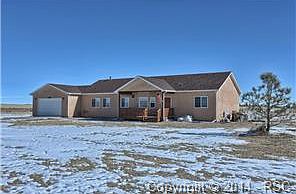 Fantastic condition stick built home on 35 acres! This stucco home is comfortable and clean, wonderful Pike Peak views and spacious bedrooms. The kitchen is generously sized with an eating area and counter seating with the refrigerator included. Master bedroom features a 5 piece bath with raised counters, tile floors and a walk in closet. The other bedrooms are generously sized with a full hall bath. The garage is oversized so larger vehicles should fit! Walk out from the kitchen to the fenced in back yard area.