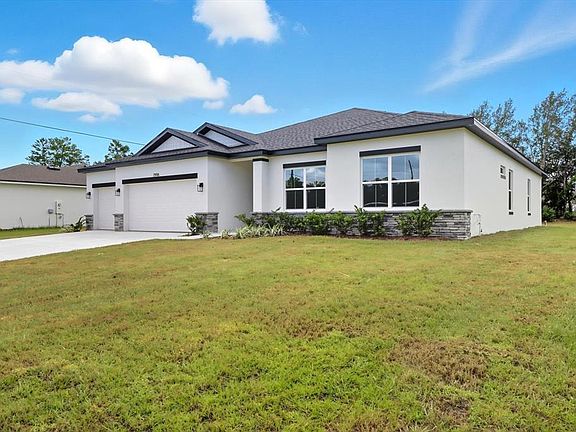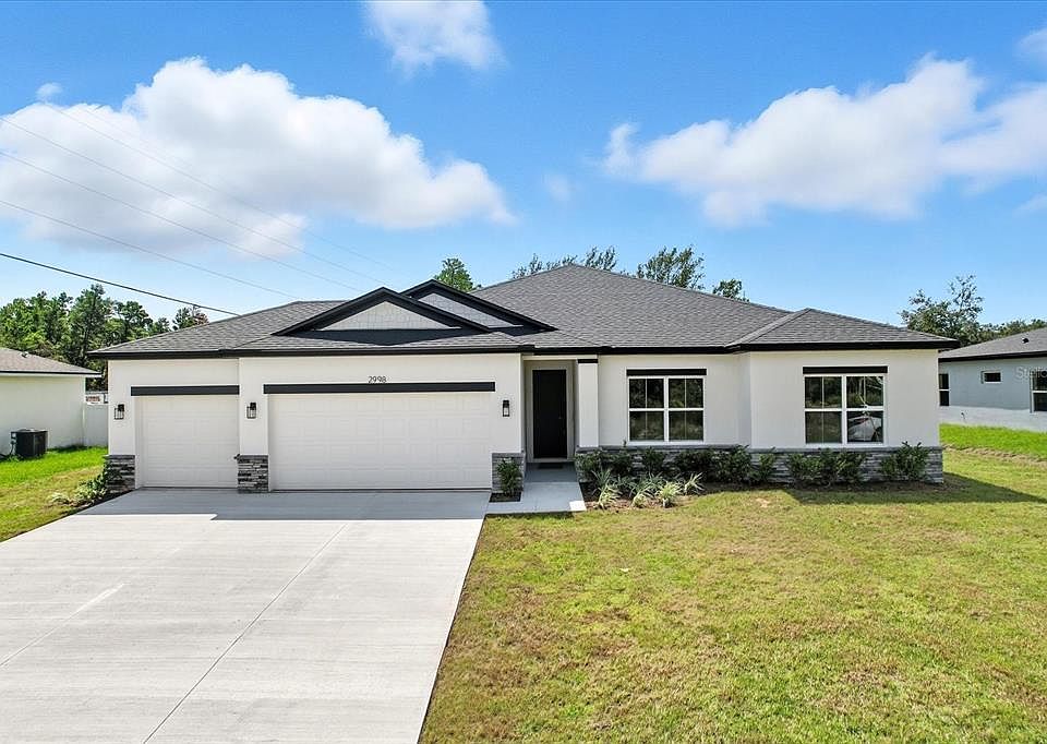 Ask about our Builder Incentives including interest rate buydown and closing cost assistance! Impeccably designed BRAND-NEW CONSTRUCTION 4-bed 3-bath-3-Car Garage home located in Marion Oaks with close proximity to everything Ocala has to offer! From the moment you arrive you will notice the difference. You are greeted by the oversized driveway, stacked stone accents, and volume 9'4'' ceilings throughout the entire home. The main living space is centered around the Living Room with stunning 8' triple panel sliding glass door that overlooks the covered lanai which perfectly integrates the indoor/outdoor living space. The kitchen showcases Dolce White Quartz countertops, Samsung stainless steel appliance suite, 42'' upper cabinets with soft-close, entertaining island, and French doors with additional access to the cover lanai. Owner's Suite features trey ceiling, oversized dual sink vanity, stunning designer shower with glass enclosure, and his & hers walk-in closets. All guest bedrooms are well sized with ample closet space. The private Guest Suite has an en-suite bathroom making it perfect for a Guest room or JR. Suite. Both Guest bathrooms feature tub/shower combo with floor to ceiling tile as well. Spacious Laundry room with an additional linen closet for added storage, plus the washer and dryer are included in the sale! Don’t miss your opportunity to make this house your HOME…Schedule your private tour today!