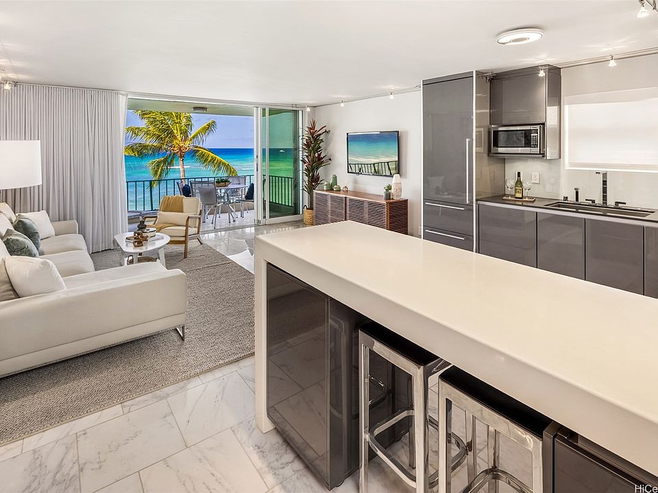Sleek, modern, spectacular! Exquisitely renovated Gold Coast oceanfront apartment at the foot of Diamond Head – Designed by noted Houston architect, William Taylor – it features a custom Poggenpohl Kitchen, designer lighting, bespoke cabinetry with maximum storage, and a clean, minimalist look. Central AC, marble flooring throughout, new Fleetwood doors and windows. Embrace sun, surf, and paddling & leisurely walks in Kapiolani Park at the quiet edge of Waikiki.