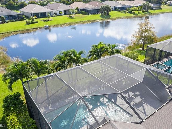 TRULY A REMARKABLE HOME. It's a rare find when you discover a mid range home with million dollar upgrades. This home offers 2 bedrooms, a study/den and a formal dining room which is currently being used as a exercise room. Beautiful and bright, the sliding barn doors close off the exercise room for privacy. PLANTATION SHUTTERS, custom ceiling fans and light fixtures add to the already beautiful interior. ALL the floors throughout (except for the bathrooms, have been replaced with elegant (LVP) WOOD FLOORS. The roomy eat-in kitchen features stainless steel BOSCH APPLIANCES and a HIGH END RANGE by SMEG. The screened in lanai has an oversized heated pool, an OUTDOOR KITCHEN, and ELECTRIC HURRICANE SHUTTERS. The mature landscaping, stately front elevation and views of a fresh water lake are stellar and never gets old. Verandah has created a wonderful lifestyle with two 18-hole championship golf courses, tennis courts, a state-of-the-art fitness center, a community pool, pickleball, and bocce ball courts....there's even a Doggy Park for man's best friend. For those who love outdoor activities, how about venturing out and KAYAKING on the adjacent ORANGE RIVER, or going for a nice bike ride or walk on the 9+ miles of trails? Verandah is conveniently located to Downtown Ft Myers, the Caloosahatchee River, and both the Ft Myers and Punta Gorda Airports.
