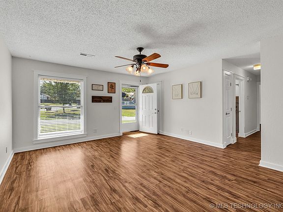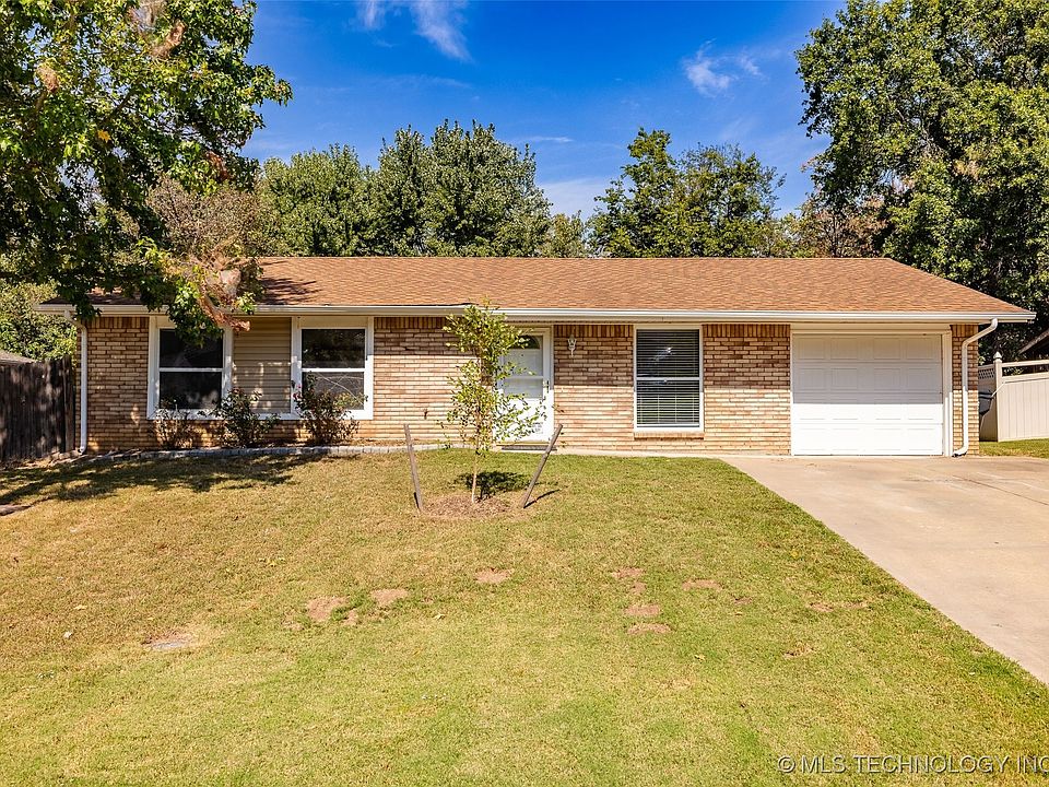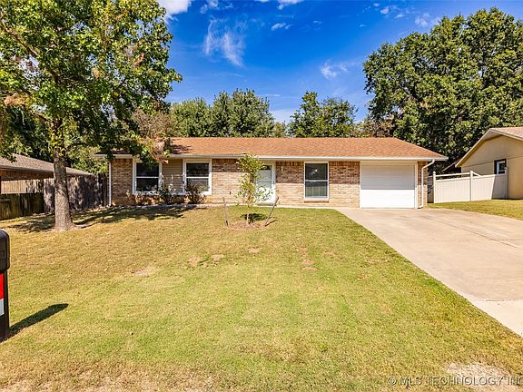 Welcome Home! This adorable single-story brick home in Coweta features fresh paint and newer flooring throughout for a bright and airy feel. The home offers 3 bedrooms, 1 full and 1 half bathroom, and a generously-sized bonus/flex space (converted garage, heated and cooled). The kitchen features ample cabinet and counter space and opens up nicely to the dining and living spaces. Out back, you'll find a large covered patio, an in-ground storm cellar, and a shop with electric (approx 15x30). This lot backs to a peaceful greenbelt for added privacy. Gun safe in bedroom to be removed prior to closing.
