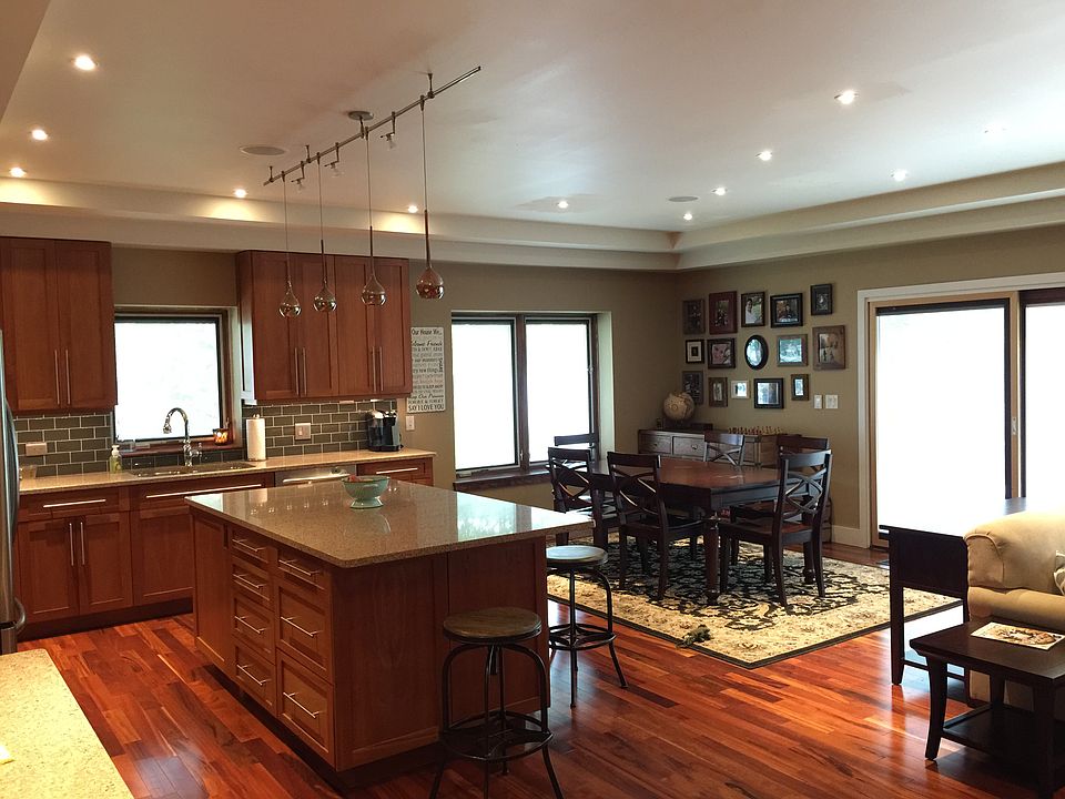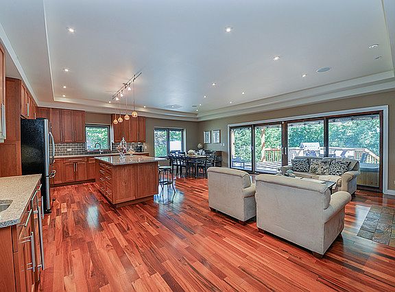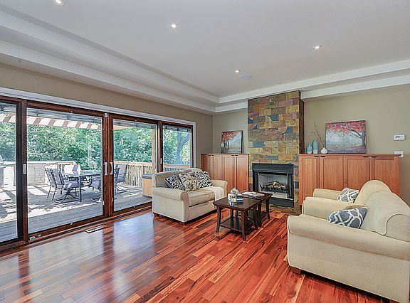 Absolutely stunning home with incredible finishes throughout! Perfect open floor plan- entertainers dream! 9-foot ceilings, recessed lighting, kitchen with gorgeous cherry cabinets and granite counters, glass backsplash open to the dining and living area with built-in cabinets and stone fireplace. Wall of windows/doors lead out to the huge deck with a pergola and built-in grill! All new Brazilian wood floors, fantastic wood work, updated paint colors, all new bathrooms, new carpet, lighting and more! Family room walks out to huge brick paver patio with built in fire pit and landscaped fenced back yard. Loads of storage in the expanded custom garage with built-in cabinets, work area, refrigerator-also heated & cooled. This unique home won't last, a stunner from top to bottom. Detailed list of upgrades available. Wired "Smart", this home has every bell and whistle available, owners sad to leave but excited for lucky new buyer!