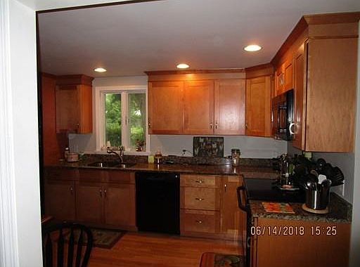 Location, location: small dead end street, walk to down town, easy access to rail trail. Beautiful new kitchen with granite counters, recessed lighting and dining area. Nice living room with FP, large family room with FP and attractive wood ceiling. Hardwood floors throughout. New roof and 200 amp electric. Basement has high ceiling and bulk head. Modern security system. Nice corner lot.