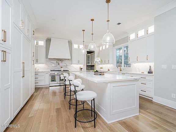 Welcome to your dream home in Rumson! Nestled on a serene 1.5-acre lot on a tranquil cul-de-sac, this spectacular home offers unparalleled luxury and comfort. Boasting a magnificent 6000 sq ft floor plan, this home features 6 bdrms, 6.5 bathrms, and impressive 10ft ceilings on the 1st floor and 9ft ceilings on the 2nd floor. Walk on exquisite 6'' white oak quarter sawn hardwood floors throughout, adding timeless elegance to every room. Entertain in style in the family room with a cathedral ceiling, or gather around the gourmet custom kitchen, complete with a 10ft island, Thermador appliances, and large walk-in pantry. Enjoy meals in the breakfast room leading to the covered bluestone patio or host formal dinners in the elegant dining room. Find relaxation in the study/playroom and (cont.) accommodate guests in the convenient guest suite. Ascend the grand center-hall staircase to discover the spacious primary bedroom with a cathedral ceiling, custom walk-in closet, and luxurious bathroom. On the 2nd floor, you'll also find four additional generous bedrooms with custom closets, three bathrooms, a laundry room, and a large bonus room overlooking the picturesque landscape complete the second floor. The finished basement is an entertainer's delight, with entrances from the center hall stairs. With over 2000 sq. ft of space, the basement includes a playroom, gym with locker room, media room, full bedroom, and full bathroom. All together, this home has 8000 sq ft of well-designed living space. Enjoy the convenience of being close to beaches, ferry access, and top-rated schools. Experience the epitome of luxury living in this superbly located home.