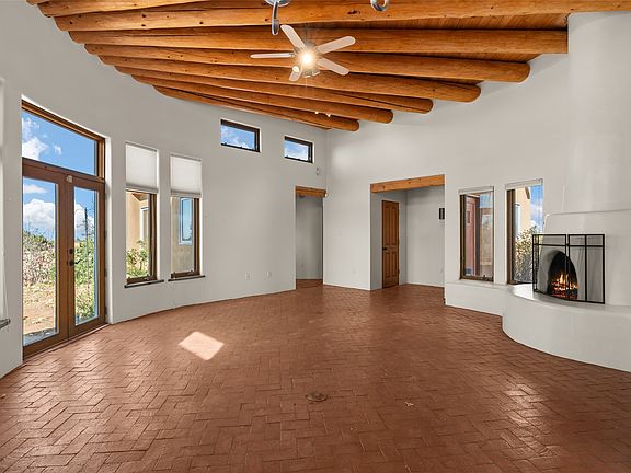 This delightful single level Eldorado home comes with tons of Santa Fe charm. The great room has soaring ceilings with vigas, brick floors, a massive Kiva fireplace and views in several directions. The fabulous kitchen enjoys a center island, loads of counter space and direct access to an outdoor dining area. There is separation between the primary suite and guest bedrooms and all of the rooms have ceiling beams with wood decking. With solar panels on the roof, in-floor radiant heat and mini-splits (in the bedrooms) for AC the property blends modern comforts with old world organic forms and finishes. The oversized, heated garage currently has 1 door for vehicles but another could be added or continue to use it as an artist studio. Towards the back of the Eldorado community, this property offers privacy, views and access to trails. Come and Enjoy!