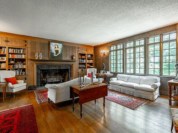 Walk through the charming arched doorway with a wooden and wrought iron door, to the foyer, which showcases hardwood flooring that extends into the heart of this home. The stunning living room includes tall ceilings and windows, a large stone fireplace surrounded by built-ins, and original wood paneling. Enjoy the modern amenities of an updated kitchen with stainless steel appliances, large eat-in island, and glass door upper cabinets. This home also includes four bedrooms, 3.5 updated bathrooms, a full basement with wine cellar, two car garage, and cozy guesthouse (1,131 sq ft) hat has it's own kitchen, bedroom, large living areas and full bathroom. (would be an ideal Airbnb). The property feels private with mature trees, and includes a greenhouse, patios, and walkways that meander through a landscaped yard.