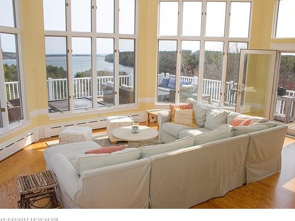 The view is even more spectacular in person! This stunning contemporary sits perched 100 ft above sea level with breathtaking panoramic views to soak in from every window , wrap around decks and roof deck! 3 Large bedrooms and a 3rd story bunkhouse. Sun filled, open concept octagon design is perfect entertaining home, designed to perfection. Your own private wooded retreat with acres of privacy with ROW to Atkins Bay and a mooring... Extremely quiet and isolated, yet only minutes away from Popham Beach/Club!