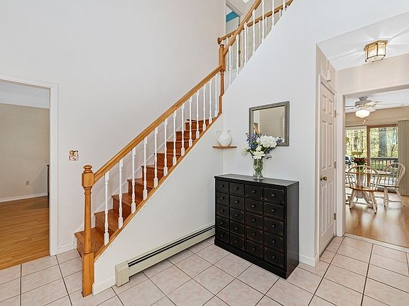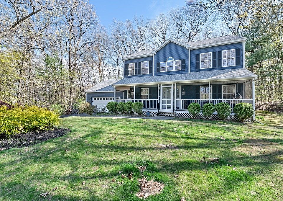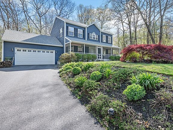 Located on a cul-de-sac set back from the road, this 3 bedroom, 2.5 bath home is loaded with curb appeal! The huge Farmer's porch & the two-story foyer are two of the highlights entering this home. The oak cabinet kitchen has sliding pull-out drawers, pantry/broom closet and an island with a breakfast bar.The slider in the breakfast room leads to a 10 x15 entertainment size deck. Off the kitchen is the family room with wood burning stove and a newly installed triple window facing the backyard. The large primary suite has a walk-in closet and adjoining bath with whirlpool tub, shower and two separate vanities. Recessed lights, hardwood floors, new "wood look" laminate flooring (2022,) newer roof (2019) repaved driveway (2019), irrigation system, oversized garage and the exterior of the home has just been painted! Situated on over an acre of landscaped grounds overlooking the woods for privacy, this home is minutes to the beach at Lake Maspenock. Summer is just around the corner!